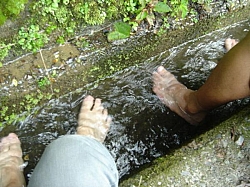 ・・・朝日をバックに那賀川の土手を走るのは気持ちええなあ・・・途中冷たい山水に疲れた足を浸してリフレッシュ出来るし、コリャ最高やなあ!!