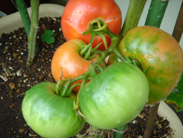 今日は雨が降ったけん身が割れたんをいいことに早速カブリつく母・・・うれしそうやなあ。(私はトマトは苦手です)